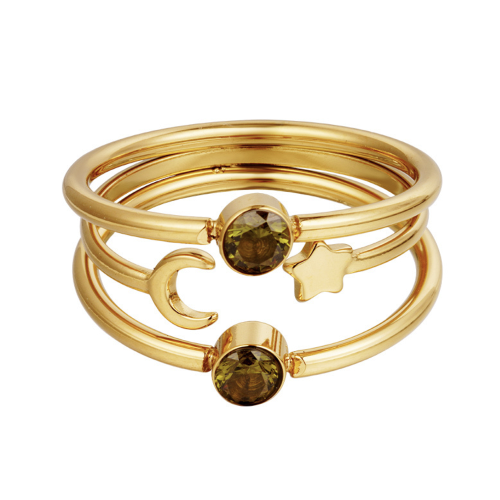 Heart eyes for this baby! Onze Gold Galaxy Stone Ring heeft een mooie maan, ster en olijfgroene steentjes in het midden. Heel leuk om te combineren met onze andere ringen!
