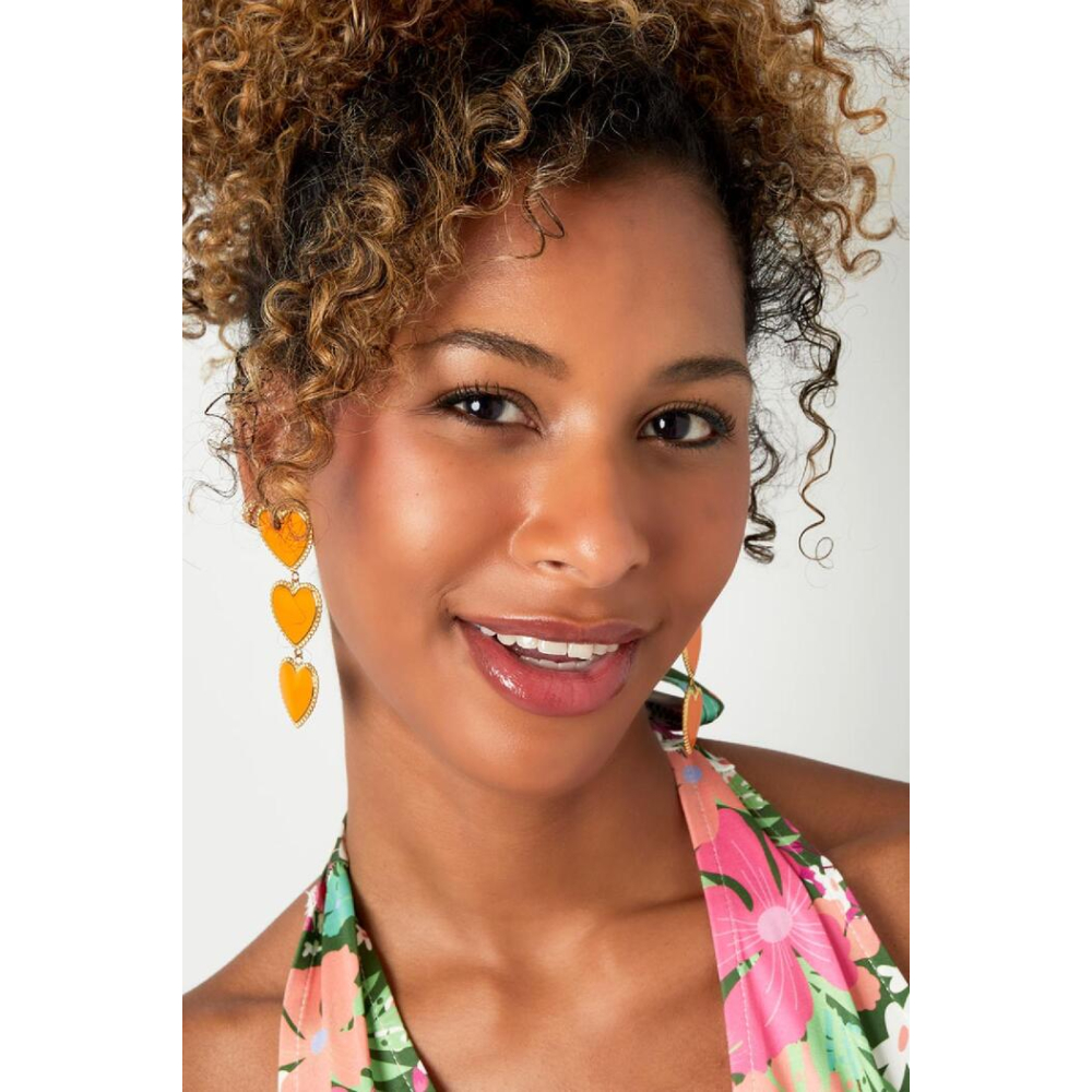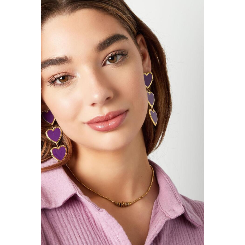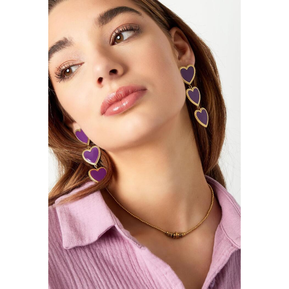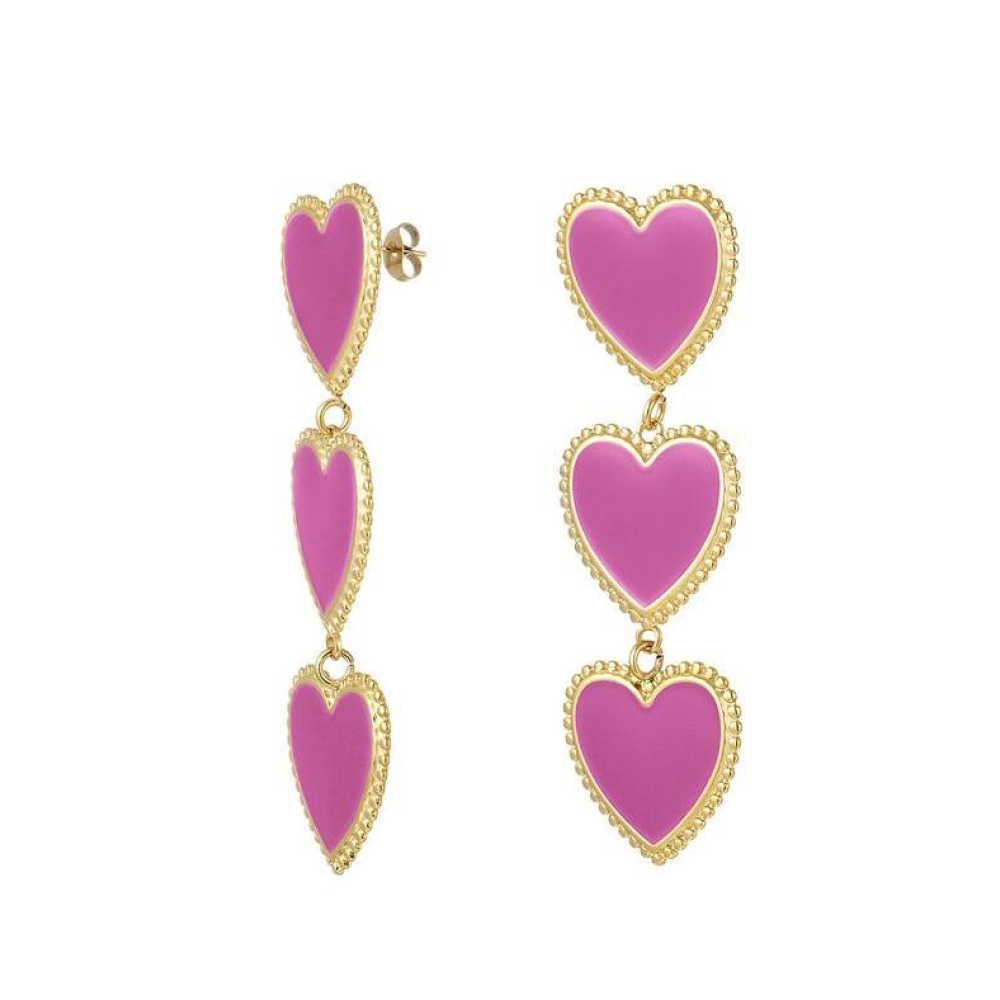 Hoe tof zijn deze gouden statement oorbellen met drie roze sierlijke hartjes op een rij! De oorbellen zijn voorzien van een prachtig randje om de hartjes. Superleuk om jouw outfit af te stylen en deze oorbellen te combineren met meerdere paarse accessoires! Deze oorbellen zijn gemaakt van stainless steel en enamel en hebben een afmeting van 7,5 cm!