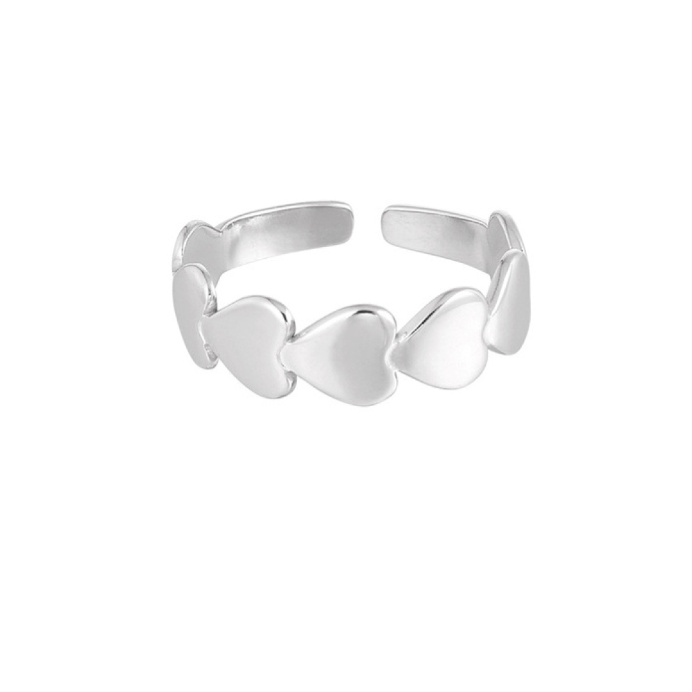 Wauw! Shop nu deze prachtige zilveren ring met aaneengesloten hartjes van Yehwang! De ring is superleuk en perfect te combineren met meerdere ringen voor een toffe ring party. De ring is gemaakt van stainless steel en is one size, perfect naar elke vinger te vormen. Verkrijgbaar in de kleuren zilver en goud.